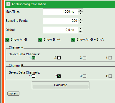 Note: If the cable lengths are different for both detectors, photons simultaneously registered at the detectors arrive a different times at the photon counting TCSPC unit. Consequently, a systematic shift of the red and the yellow curve is observed. For compensation adjust the “Offset” parameter. It automatically moves the red and yellow curve to the correct position. Press “Calculate” again to recalculate the correct antibunching curve.